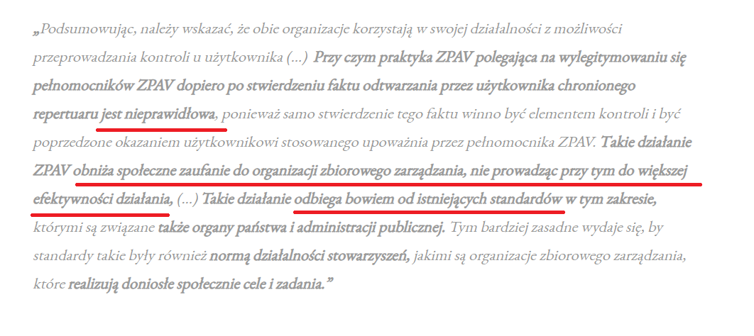 – OZZ, gdy nie masz z nimi umowy, może Cię jedynie informować o obowiązku posiadania umowy, jeśli odtwarzasz publicznie i zarabiasz na tym, nie może jednak niczego stwierdzać arbitralnie. Jeśli uznają, że łamiesz prawo, powinni zebrać dowody i pozostawić je do oceny sądu, jak w każdej sprawie.