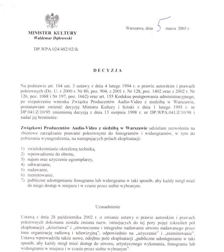“Związkowi Producentów Audio-Video z siedzibą w Warszawie udzielam zezwolenia na zbiorowe zarządzanie prawami pokrewnymi do fonogramów i wideogramów, w tym do pobierania wynagrodzenia, na następujących polach eksploatacji: