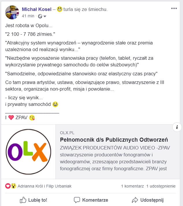 Jak wiecie z poprzedniego tekstu, OZZ to zwykłe, prywatne stowarzyszenia, które wg celów statutowych reprezentują artystów i mówiąc kolokwialnie, chodzą po firmach i “tylko informują”, że publiczne odtwarzanie, z którym wiąże się osiąganie korzyści majątkowych narusza ustawę, po czym pytają, czy dany przedsiębiorca tę ustawę narusza. Jeśli narusza, to pobierają opłaty od tego przedsiębiorcy, a następnie mogą jedynie przekazać tę kwotę artyście, którego prawa naruszył potrącając jedynie kwotę jako koszt obsługi tego przekazania.